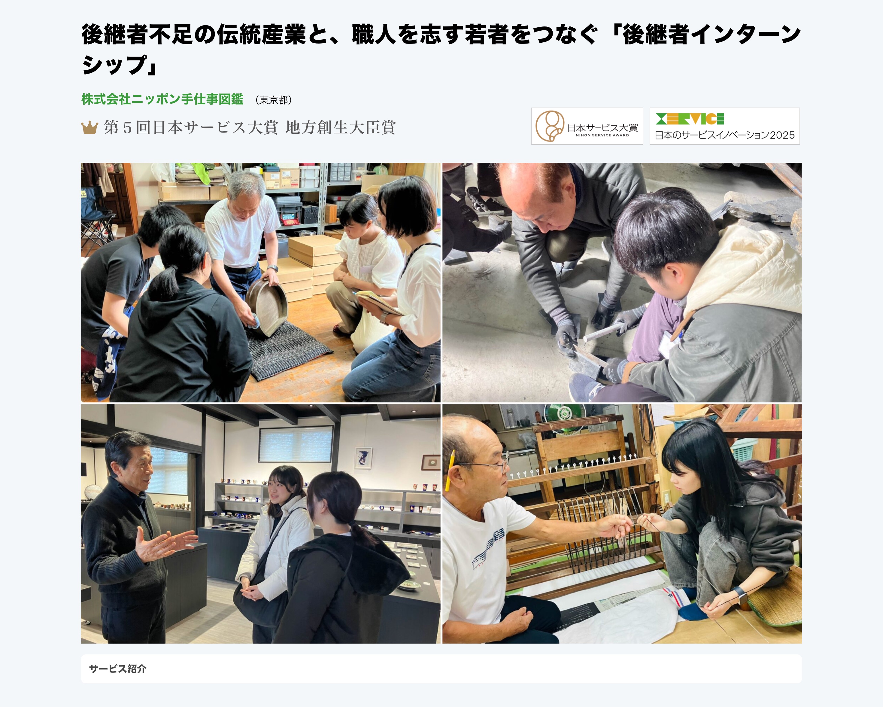 「日本のサービスイノベーション2025」に「後継者インターンシップ」の