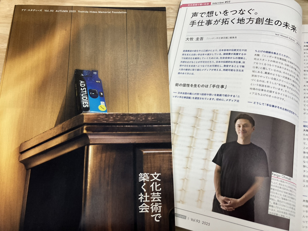 ニッポン手仕事図鑑 編集長・大牧のインタビュー記事が、公益財団法人吉田秀雄記念事業財団が発刊する、広告・マーケティング分野の研究者・実務家向けの研究広報誌『アド・スタディーズ』に掲載されました!